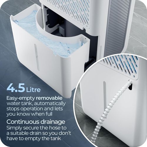 A generous 4.5 litre water tank provides ample capacity for everyday use, with an auto shut off feature once the tank is full. Those seeking even greater convenience can make use of the continuous drainage option, allowing the appliance to operate for longer periods without interruption. The automatic humidity sensor monitors conditions in real time and adjusts output accordingly, with a clear digital display providing at-a-glance information and straightforward control.