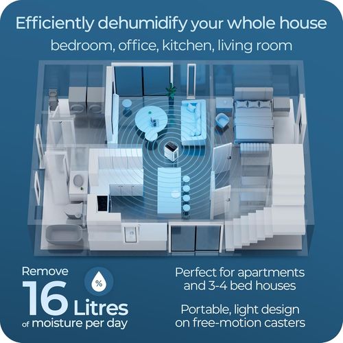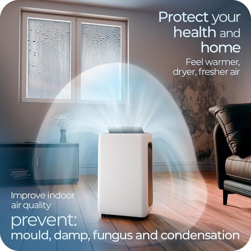 With the ability to extract up to 16 litres of moisture per day, it is ideally suited to rooms of up to 64m³, tackling damp, condensation and musty odours with ease. Despite its powerful performance, the unit remains compact in design, and thanks to smooth swivelling castors it can be moved effortlessly between rooms whenever required.