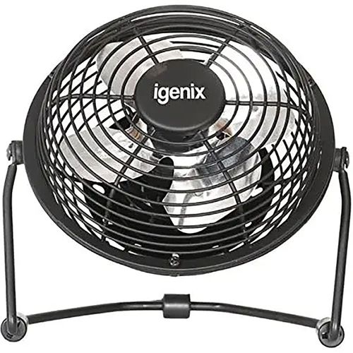 Igenix DF0004 4" USB powered black desk fan, featuring a high quality metal construction and aluminium fan blade. Other features include a 1.5m long USB power cable, on/off switch and tilt function.