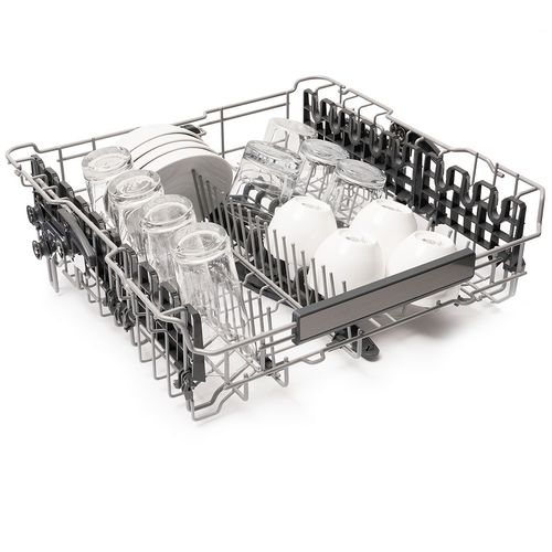 Cleaning performance is enhanced with triple spray arms, ensuring every corner of the dishwasher reaches even the toughest, baked-on stains. The flexible upper basket adjusts to three different height levels—ideal for fitting larger pans or tall glasses. Spikes in both the upper and lower baskets fold down to create more space, while the slidable third rack is perfect for cutlery and small utensils. It can even be reconfigured to make room for taller wine glasses below.