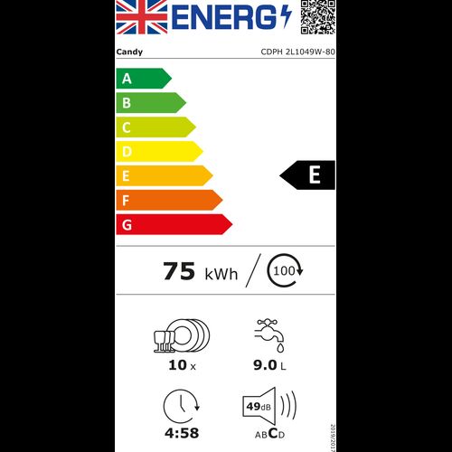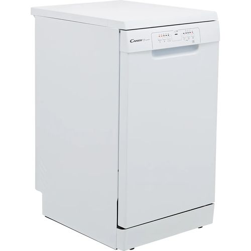 Inside, the height adjustable upper basket provides added versatility, making it easier to accommodate taller plates or bulkier pans in the lower rack. With an E energy rating, the dishwasher delivers dependable cleaning performance with considered energy use. Designed for simplicity and convenience, this Candy slimline model is a reliable choice for smaller households or apartments seeking an efficient, space-saving dishwasher.