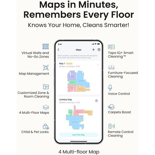 With an impressive 5300Pa of suction power, the RV30MAXPLUS lifts away dirt, dust, and debris with ease, tackling both hard floors and carpets effectively. When switching to mop mode, the appliance cleverly avoids carpets to protect your soft furnishings, while maintaining a consistent and efficient clean on tiled or wooden surfaces. The unit is further enhanced by Tapo IQ+ smart cleaning, powered by an array of sensors and an advanced algorithm, allowing it to adapt to changing conditions and tailor its cleaning patterns for maximum efficiency.