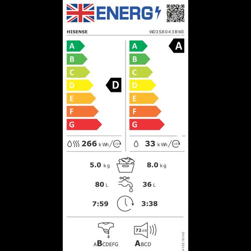 The Hisense WD3S8043BW3 freestanding washer dryer is a stylish and efficient appliance, crafted to simplify laundry days while delivering excellent results.