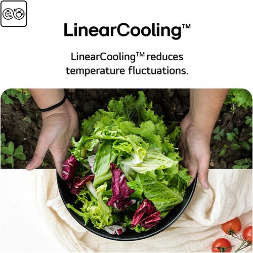 The generous 420-litre fridge section provides ample space for fresh food storage, with 4 adjustable shelves, 2 salad drawers, and 4 door balcony shelves for maximum organization. The bright LED interior lighting ensures excellent visibility across all shelves, while LG NatureFRESH technology helps keep your fruits, vegetables, and other perishables fresh for longer.