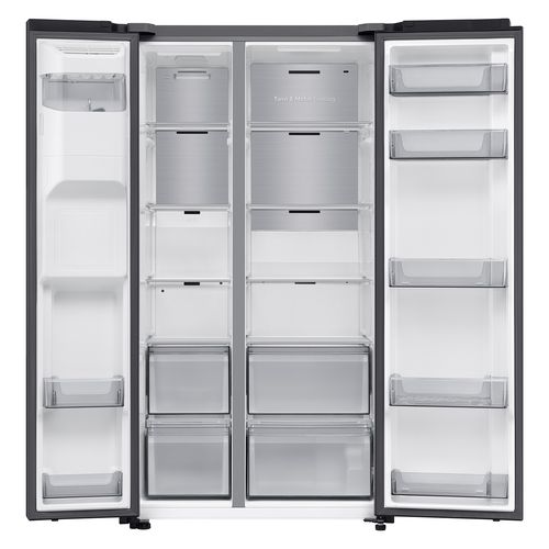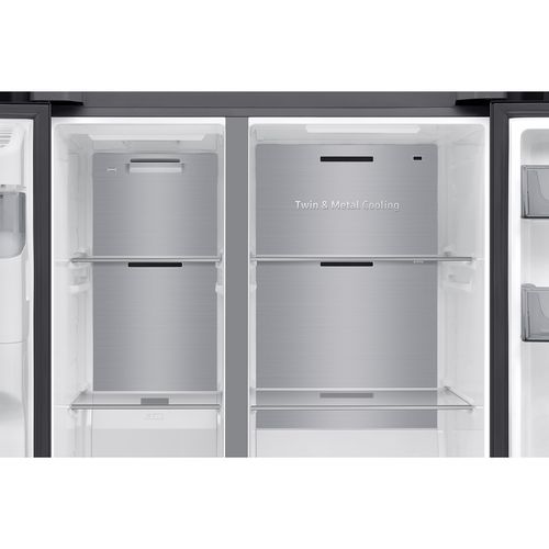 Bring style, space and smart technology to your kitchen with the Samsung RS70F66KCF American-style fridge freezer. Finished in sleek black, this spacious side-by-side appliance offers an impressive 634 litre total capacity, combining advanced cooling technology with flexible storage and modern connectivity.