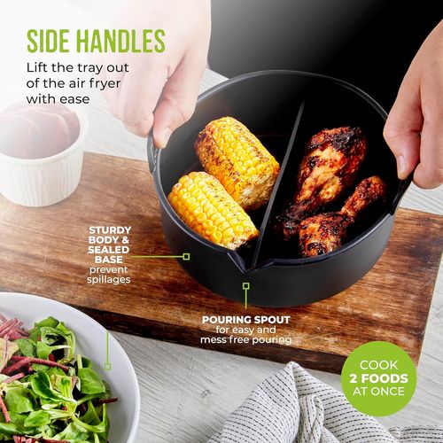 Perfect for use in any 4L Tower air fryer or oven, the side handles make it easier to lift each tray out of the air fryer for added safety. The sealed base allows for a greater choice of delicious recipes, such as mouth-watering pasta bakes, succulent pies or juicy apple crumbles