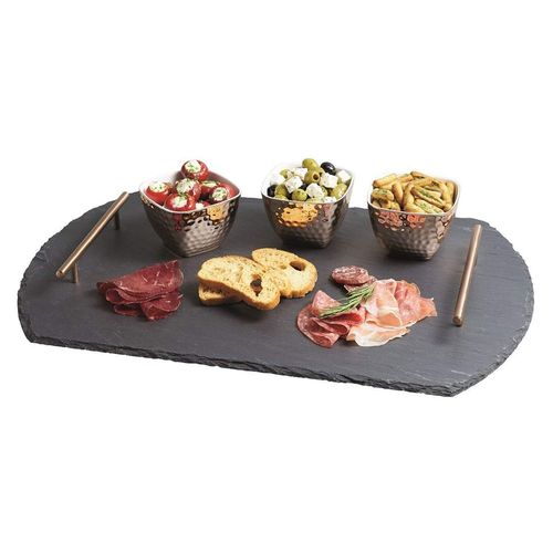 This serving slate with porcelain and copper finish serving bowls is a lovely way to showcase your appetisers and antipasti with style.